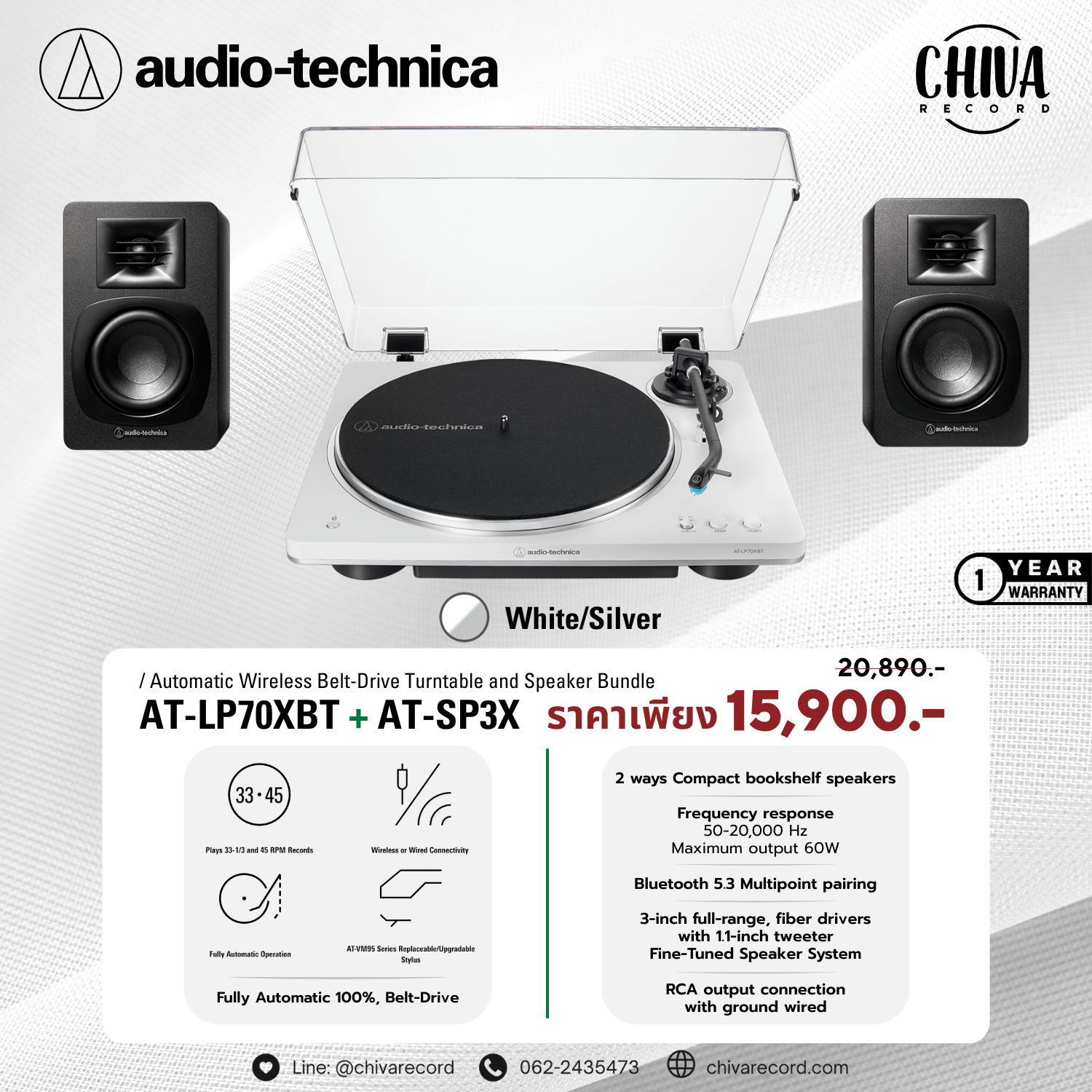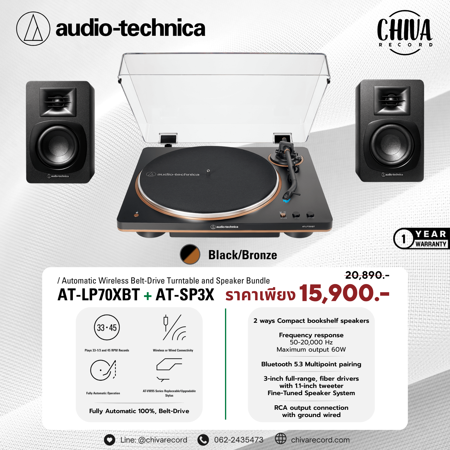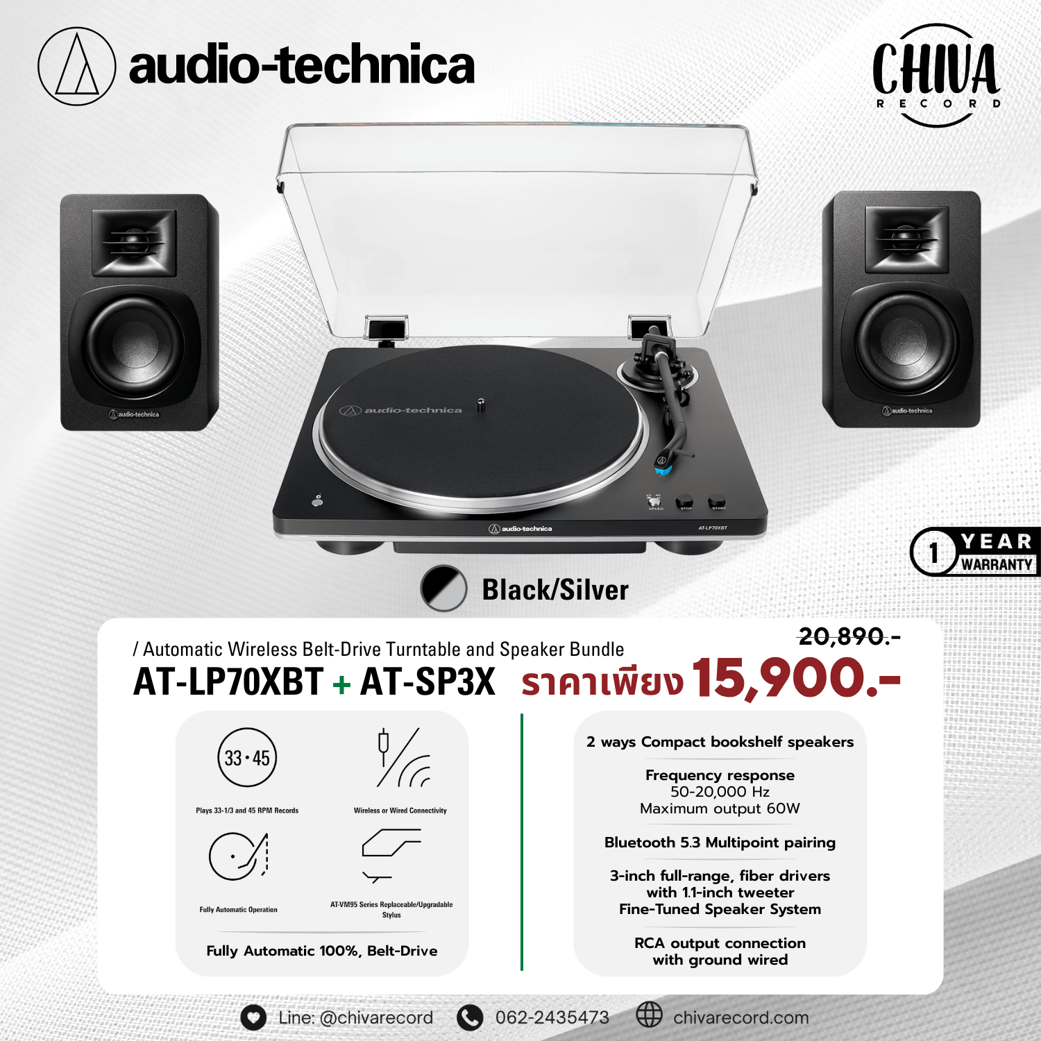 เครื่องเล่นแผ่นเสียง Audio Technica AT-LP70XBT + ลำโพง Audio Technica AT-SP3X (New)