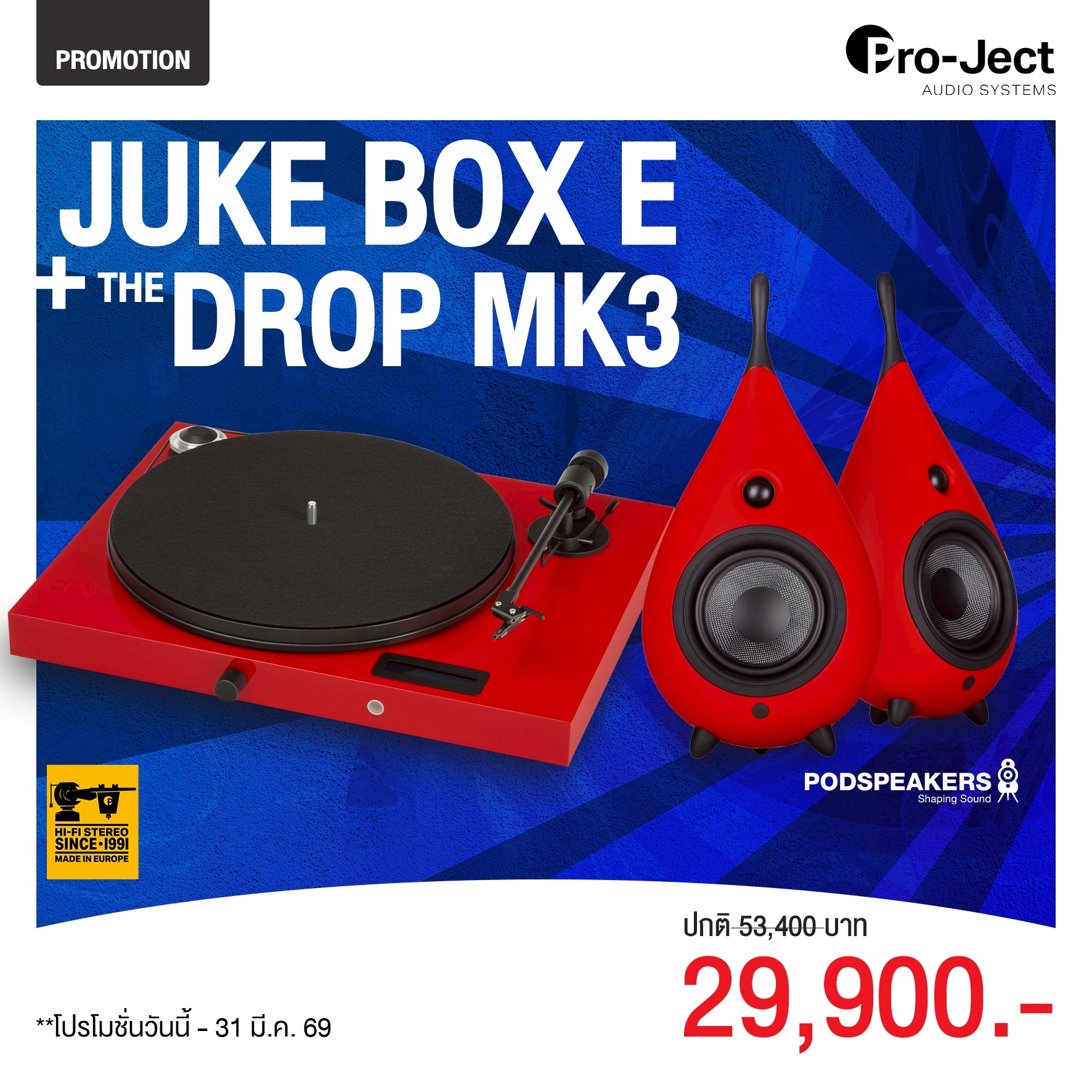 เครื่องเล่นแผ่นเสียง Pro-Ject Juke Box E RED + ลำโพง Podspeakers The Drop MK3 RED (New)